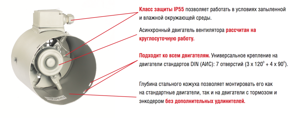 В современных промышленных системах всё чаще применяются электродвигатели с электромагнитным тормозом, работающие в режимах с пониженной частотой вращения. При этом возникает критическая проблема: штатный вентилятор, установленный на валу, теряет эффективность охлаждения. На низких оборотах (n<0,5nном) интенсивность воздушного потока падает пропорционально скорости, что ведёт к перегреву двигателя и сокращению срока службы.