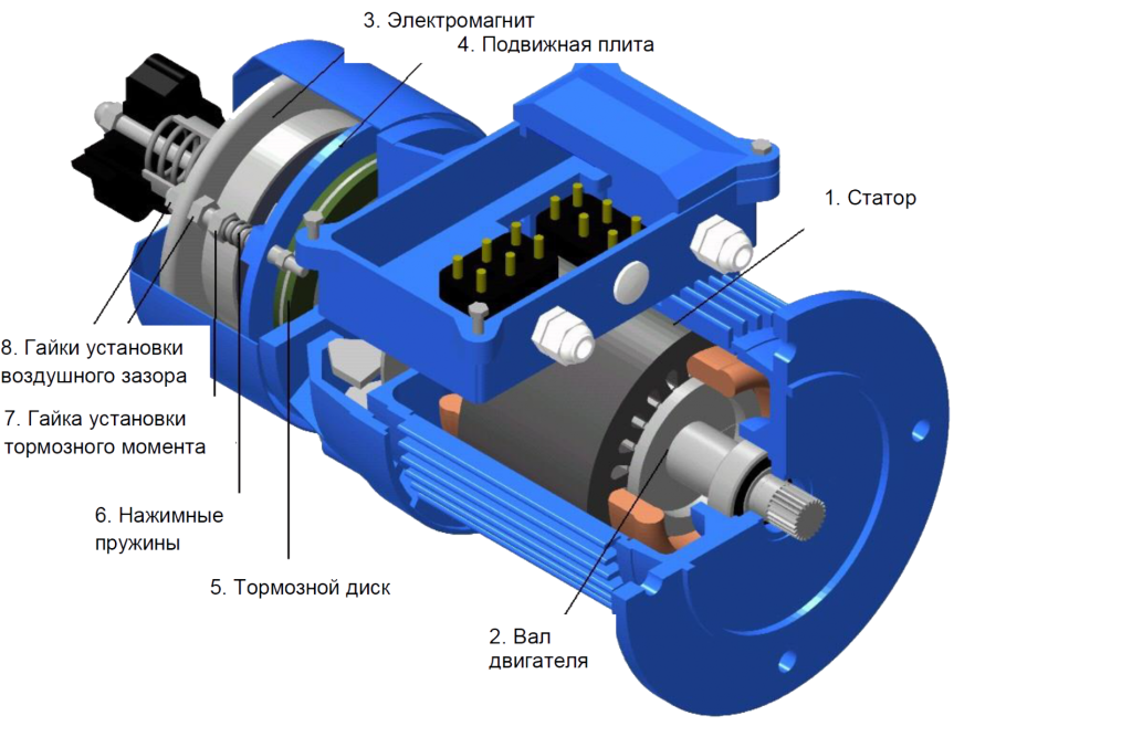 - Электромагнитный тормоз (катушка, якорь, пружины, тормозной диск с фрикционными накладками).